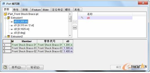 從iPart編寫器的界面中我們能夠看到,設(shè)計(jì)過程中的各種參數(shù),特性,和特征,iFeature,iMate,螺紋等都能夠進(jìn)行編輯,控制其在不同的成員之間的尺寸變化和特征抑制。需要注意的是,特征的抑制/顯示是通過將對(duì)應(yīng)的參數(shù)置"0/1"實(shí)現(xiàn)的,幫助中沒有明確的說明。