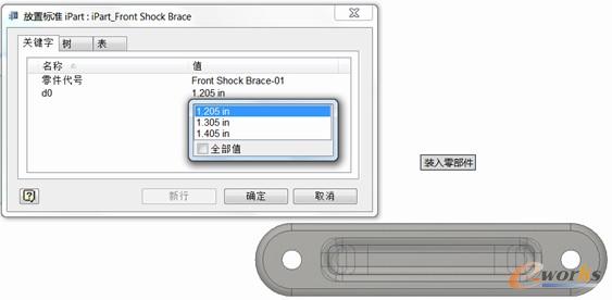 在這個(gè)例子中,我們?cè)O(shè)定參數(shù)d0為需要改變的目標(biāo)參數(shù),三個(gè)序列的值分別為:1.205in,1.305in,1.405in。用戶添加了成員(Member)之后,對(duì)不同成員的不同參數(shù)設(shè)定不同的值。INV就能夠通過這張表驅(qū)動(dòng)參數(shù)改變零件的幾何形狀。
