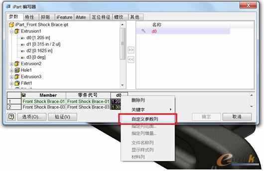 在部件環(huán)境中放置iPart會(huì)產(chǎn)生單獨(dú)的iPart成員零件,這些零件有些特殊的屬性導(dǎo)致很多功能都不能使用,就是使用受限制。但是如果用戶在iPart表中定義了"自定義參數(shù)列",那么這個(gè)iPart的成員零件的屬性就會(huì)被恢復(fù)正常,可以進(jìn)行編輯了。