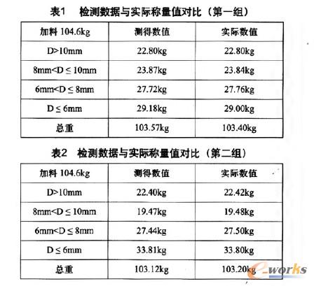 為了驗(yàn)證通訊是否成功以及組態(tài)畫面中數(shù)值的顯示值與實(shí)際值是否一致,把控制系統(tǒng)中稱重料斗中的物料分別取出來再在另外的電子稱重設(shè)備上進(jìn)行二次稱重,與原來的數(shù)值進(jìn)行比對(duì),兩次分別加入104.6kg的物料,粒度分為四種:D>10mm,8mm<D S 10mm,6mm<D 1 8mm,D S 6mm,其中D為物料的直徑。兩組數(shù)據(jù)對(duì)比如表1、表2所示。