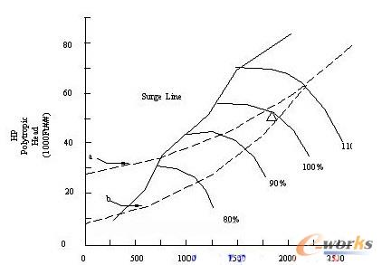 GM 離心鼓風機的性能是非線性的曲線,其性能的檢測來源于溫度傳感器,壓力變送器,流量變送器等檢測元件,就GM離心鼓風機性能曲線來講,在機組流量和壓力調(diào)節(jié)過程中存在著喘振區(qū)和安全區(qū)(非喘振區(qū))。機組不允許在喘振區(qū)工作,故對機組控制的第一要求就是將其控制在安全區(qū),即做好防喘振控制。而多種控制方式是耦合在一起的PID回路,所以要達到控制要求,就必須解耦,使機組工作在安全區(qū),即不喘振。所謂喘振:如圖1,a和b虛線是管路阻力曲線,當改變流量和壓力時,機組會在某區(qū)域造成管路急劇產(chǎn)生壓力和氣流的激烈的脈動和振動,運轉(zhuǎn)變得不穩(wěn)定了,將這種現(xiàn)象叫做喘振。