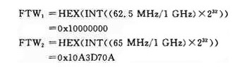 頻率調(diào)諧字是AD9957在單音頻工作模式下,實(shí)現(xiàn)信號調(diào)制的重要參數(shù)。對于中心載頻為63.75MHz,碼速率為5Mb/s的MSK調(diào)制系統(tǒng),假定AD9957的內(nèi)核時鐘為1GHz,其兩個載頻62.5MHz和65MHz的頻率調(diào)諧字(FTW)分別為:
