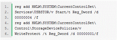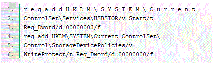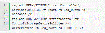 其中,第一行代碼可以將優(yōu)盤設(shè)置成禁用狀態(tài),第二行代碼可以讓用戶訪問優(yōu)盤的權(quán)限恢復(fù)到默認(rèn)狀態(tài)。
