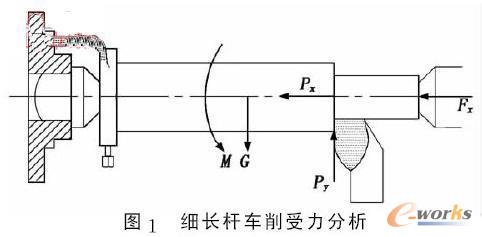 細長桿車削受力分析如圖1所示。加工過程中,細長桿件所受的外力主要有切削力(軸向切削力Px、徑向切削力Py及切向切削力Pz)、自身重力G、旋轉(zhuǎn)產(chǎn)生的離心力、軸向頂力Fx,這些力共同作用,導(dǎo)致桿件產(chǎn)生彎曲變形。桿件變形的最直接后果是產(chǎn)生振動,從而影響工件的圓柱度和表面粗糙度。一般來講,工件彎曲越大,車削時振動越大,表面質(zhì)量精度也就越難保證。