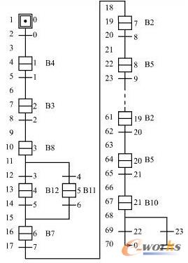 行車1鍍銀SFC程序,如圖所示。按照?qǐng)D1中的工藝流程,即:行車行走的工位和在相應(yīng)工位槽中停留的時(shí)間,編制SFC程序,兩種工藝程序步數(shù)不相同,鍍銀程序步數(shù)是70步。由于行車在走自動(dòng)程序時(shí)是步進(jìn)運(yùn)行,不同的步是由不同的電機(jī)工作,而且變頻器在運(yùn)行時(shí)必須先將電動(dòng)機(jī)側(cè)的接觸器先接通,然后變頻器的正反轉(zhuǎn)信號(hào)和速度信號(hào)才能輸出,這也要求行車必須為步進(jìn)運(yùn)行,屬于較為復(fù)雜的步進(jìn)控制。編制各個(gè)不同電機(jī)的動(dòng)作相應(yīng)的SFC子塊,子塊中包括電機(jī)控制電鍍工件在鍍槽的提升、放下和停留的時(shí)間、行車走多少個(gè)鍍槽以及運(yùn)行速度等。在走自動(dòng)程序時(shí)只需調(diào)用相應(yīng)的子塊即可很方便地完成步進(jìn)控制,邏輯關(guān)系思路清晰,各電機(jī)的動(dòng)作可靠。這樣從0步開始運(yùn)行,并依次執(zhí)行到最后一步結(jié)束或循環(huán)執(zhí)行。在運(yùn)行過程中可隨意進(jìn)行手動(dòng)干預(yù),然后從暫停處往下按順序執(zhí)行下去,直到70步結(jié)束或循環(huán)執(zhí)行。