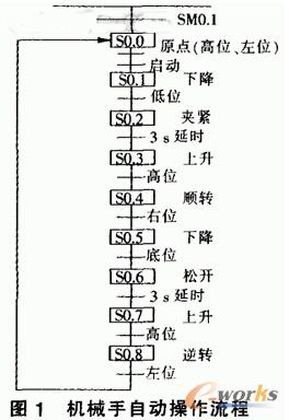 機(jī)械手自動操作流程如圖1所示。下降電磁閥通電,機(jī)械手下降。下降到底時。碰到下限位開關(guān),下降電磁閥通電。下降停止.同時夾緊電磁閥斷電,機(jī)械手放松。放松后,上升電磁閥通電,機(jī)械手上升。上升到頂時.碰到左限位開關(guān),左移電磁閥斷電。左移停止.此時機(jī)械手經(jīng)過8步動作完成一個周期的動作。
