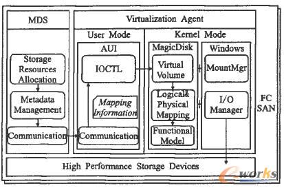 MAGICDISK與Windows平臺(tái)的I/O管理器(I/OManager)、掛載管理器(MountManager)以及I/O系統(tǒng)服務(wù)配合工作,在Windows系統(tǒng)內(nèi)部注冊(cè)虛擬存儲(chǔ)設(shè)備并將其掛載到指定的盤符上;AUI負(fù)責(zé)在帶外SAN環(huán)境下與元數(shù)據(jù)服務(wù)器(MetaData Server,MDS)進(jìn)行虛擬化指令的交互,包括存儲(chǔ)設(shè)備的映射表以及配置信息等,并將這些指令通過ioctl傳達(dá)到驅(qū)動(dòng)模塊,此外還要對(duì)當(dāng)前的存儲(chǔ)虛擬化服務(wù)狀況進(jìn)行實(shí)時(shí)監(jiān)控。