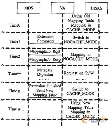 圖3表示的是在線擴(kuò)展技術(shù)的IRP執(zhí)行過程,初始階段,VA在MAGICDISK模塊當(dāng)中維護(hù)著一份虛擬卷的總體映射表,當(dāng)應(yīng)用服務(wù)器在該虛擬卷上進(jìn)行的I/O訪問傳達(dá)到內(nèi)核態(tài)時(shí),使用該表進(jìn)行映射,我們稱之為CACHE模式的映射.當(dāng)條帶化的虛擬卷開始進(jìn)行擴(kuò)展操作時(shí),首先由MDS發(fā)出擴(kuò)展的控制命令,由于涉及到元數(shù)據(jù)的重分布,因此在VA上原來的映射表已經(jīng)不再可靠,此時(shí)再次到達(dá)該虛擬卷的IRP要?dú)w入特殊隊(duì)列統(tǒng)一處理,使用寫時(shí)請(qǐng)求的方法,即對(duì)于每一個(gè)到達(dá)MAGICDISK模塊的IRP,都要先從中獲取邏輯起始地址,將其封裝為指定的REQUEST包,而后作為請(qǐng)求映射信息通過AUI模塊發(fā)送給MDS,MDS接收到REQUEST包后,將與之對(duì)應(yīng)的當(dāng)前最新的映射信息封裝為RESPONSE包,發(fā)還給VA,然后,MAGICIDISK模塊再根據(jù)本次獲取的映射信息完成相應(yīng)的映射操作,這種映射方式我們稱之為NOCACHE模式。