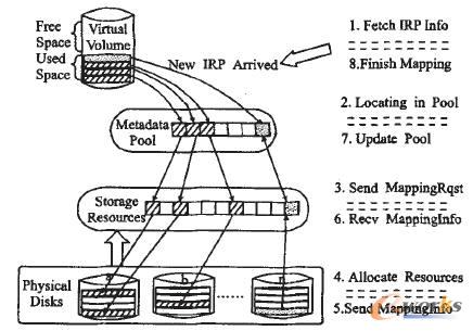 為了實(shí)現(xiàn)這一功能特性,VA要在MAGICDISK模塊為虛擬卷的一系列邏輯空間地址段維護(hù)統(tǒng)一的元數(shù)據(jù)存儲(chǔ)池,從MDS端獲得的每一段映射信息都保存在這個(gè)存儲(chǔ)池當(dāng)中,每當(dāng)上層應(yīng)用程序?qū)壿嫷刂房臻g的需求有所增長(zhǎng)時(shí),都要利用AUI向MDS發(fā)送新的映射請(qǐng)求,MDS在接收到該請(qǐng)求信息后,就會(huì)在統(tǒng)一存儲(chǔ)池中動(dòng)態(tài)地再分配一部分存儲(chǔ)資源并將映射信息發(fā)還給VA。