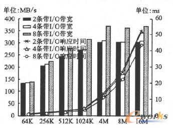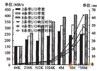 將條帶化的虛擬卷命名為條帶卷(Striped Volume),在第3組測(cè)試中,先將一個(gè)由2條帶構(gòu)成,大小為200G的條帶卷格式化為NTFS文件系統(tǒng),在此基礎(chǔ)之上再為其擴(kuò)展2個(gè)條帶使容量增加到400G,最后再擴(kuò)展4個(gè)條帶使容量增加到800G,在這期間同樣使用測(cè)試工具IOMETER對(duì)條帶卷分別進(jìn)行順序讀與順序?qū)懖僮鳎瑴y(cè)試I/O讀寫帶寬和I/O平均響應(yīng)時(shí)間,由此對(duì)條帶卷進(jìn)行擴(kuò)展前后的性能對(duì)比,其中測(cè)試的塊大小范圍為64K~16M,測(cè)試結(jié)果如上頁(yè)圖7和圖8所示,可以很明顯地看出條帶卷在經(jīng)過擴(kuò)展之后的I/O讀寫帶寬顯著增加,I/O平均響應(yīng)時(shí)間明顯減少,由此可說明經(jīng)過在線擴(kuò)展之后,條帶卷不僅在容量上得到了擴(kuò)展,在性能上同樣得到了很好地?cái)U(kuò)展.