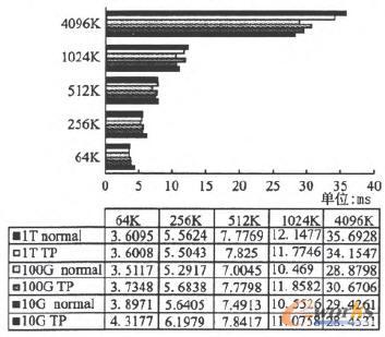 第2組實(shí)驗(yàn)測(cè)試按需分配卷與普通虛擬卷的I/O帶寬以及I/O平均響應(yīng)時(shí)間的對(duì)比情況,分別對(duì)大小為10G、100G、1T的按需分配卷和與其容量相同的普通虛擬卷進(jìn)行混合隨機(jī)讀寫測(cè)試,其中測(cè)試的塊大小范圍為64K~4M,隨機(jī)讀操作占80%,隨機(jī)寫操作占20%,結(jié)果如圖5和圖6所示,通過性能對(duì)比我們可以看出,使用不同大小的按需分配卷進(jìn)行I/O混合讀寫操作時(shí),與普通虛擬卷的性能差別并不大,這是由于使用了實(shí)用高效的地址映射機(jī)制和通信策略,能夠很好地減小元數(shù)據(jù)存儲(chǔ)池的訪問壓力。