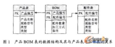 BOM表達(dá)的是產(chǎn)品與零部件之間的關(guān)系,具體內(nèi)容包括一個(gè)產(chǎn)品是由哪幾個(gè)零件或是部件組成,每個(gè)零部件又在這個(gè)產(chǎn)品中需要幾個(gè)。而在實(shí)際應(yīng)用中,還要根據(jù)工廠的具體情況加上這個(gè)零件或是部件的加工方式(生產(chǎn)/外購(gòu))信息和備注信息。由于產(chǎn)品和配件都有可能有重復(fù)的名字,所以對(duì)產(chǎn)品和配件都進(jìn)行了編號(hào),具體每個(gè)產(chǎn)品和配件的其它信息要到產(chǎn)品表和配件表中進(jìn)行查詢得到。所以,整個(gè)BOM表的實(shí)體屬性圖及其與產(chǎn)品表與配件表的關(guān)系如圖1所示。