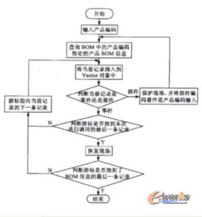 在Java2中的Vector類可以支持動(dòng)態(tài)數(shù)組,并且可以將不同類型的對(duì)象(當(dāng)然相同類型的對(duì)象更沒有問題)引用到Vector類的對(duì)象中去。Vector引用的對(duì)象存儲(chǔ)的是一條條BOM 信息,而不是一個(gè)個(gè)的ResultSet數(shù)據(jù)集,所以在構(gòu)建Vector對(duì)象時(shí)就必須對(duì)每一次查詢得到的ResultSet數(shù)據(jù)集中的BOM信息進(jìn)行重新處理,使數(shù)據(jù)集中的BOM信息能夠按照要顯示的1頃序在Vector對(duì)象中排列好。這是一個(gè)先序遍歷過程,具體操作過程流程如圖3所示。