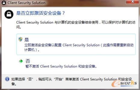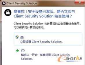這時進(jìn)入Windows系統(tǒng)就會看到安全設(shè)備已激活的信息。點(diǎn)擊確定以設(shè)置Client Security Solution