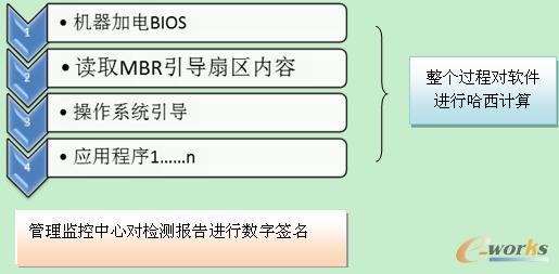 TPM會按照整個系統(tǒng)及應(yīng)用軟件棧的裝載順序來監(jiān)視裝載到計算平臺上的系統(tǒng)軟件及所有應(yīng)用軟件,TPM采用哈希擴(kuò)展算法,以哈希值特征的形式來存儲所有能夠被平臺裝載的全部軟件。例如,在X86平臺運(yùn)行過程中,從機(jī)器加電啟動開始,TPM將按照如下的順序監(jiān)視軟硬件系統(tǒng)及應(yīng)用軟件棧的裝載過程:BIOS、MBR、OS裝載器、OS、用戶應(yīng)用程序1-n. TPM將計算平臺上的整個軟件鏈的哈希值進(jìn)行記錄,之后就能夠把該平臺上的軟件加載狀況向管理中心報告。TPM可以對每個報告進(jìn)行數(shù)字簽名,確保報告的真實性。
