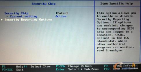 1.在開機(jī)時按F1,進(jìn)入Security安全欄選中Security Chip,使得在啟動狀態(tài),如下圖所示