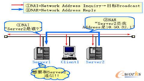 處在同一網(wǎng)段之間的兩個(gè)設(shè)備,在最初系統(tǒng)啟動(dòng)的時(shí)候,其Node 名稱通過(guò)廣播包問(wèn)詢的方式來(lái)進(jìn)行,當(dāng)一個(gè)設(shè)備(如server)需要訪問(wèn)另一個(gè)設(shè)備時(shí),是根據(jù)另一臺(tái)設(shè)備的Node 名稱來(lái)進(jìn)行訪問(wèn),正常情況下,ACE 的服務(wù)器端接口中會(huì)有需要通信的目標(biāo)Node 名的對(duì)應(yīng)地址,但是某些情況下,發(fā)送方可能不知道接收方的網(wǎng)絡(luò)地址,發(fā)送方就會(huì)向整個(gè)網(wǎng)段內(nèi)進(jìn)行廣播,接收方會(huì)將自身的網(wǎng)絡(luò)地址返回給發(fā)送方(見(jiàn)圖3-8),整個(gè)傳輸過(guò)程中不需要DNS 檢索和hosts 文件解析。發(fā)送方收到以后會(huì)將接收方的Node 名和對(duì)應(yīng)地址發(fā)送到ACE 的服務(wù)器端,這樣下次相同的通信就不需要再次進(jìn)行廣播查詢。