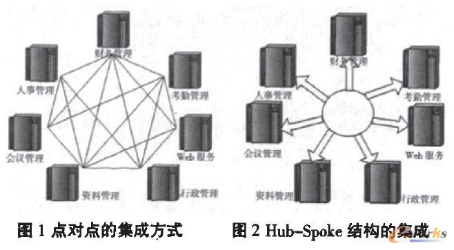 圖1所示點(diǎn)對(duì)點(diǎn)集成結(jié)構(gòu)存在著嚴(yán)重的隱患,即隨著應(yīng)用系統(tǒng)個(gè)數(shù)的增加。接口的數(shù)目將快速增長(zhǎng),其總數(shù)為n(n-1)個(gè)接口(n為應(yīng)用系統(tǒng)個(gè)數(shù))。應(yīng)用系統(tǒng)之間存在著高度的耦合性。這為系統(tǒng)的維護(hù)帶來(lái)巨大的復(fù)雜性,任何一個(gè)系統(tǒng)的升級(jí)和改動(dòng)都將影響到其他與之相關(guān)的應(yīng)用系統(tǒng)的修改。隨著控制技術(shù)和信息技術(shù)的發(fā)展,企業(yè)信息化涉及到的子系統(tǒng)越來(lái)越多,點(diǎn)對(duì)點(diǎn)的集成方式已無(wú)法滿足需求。傳統(tǒng)的EAI技術(shù)試圖通過(guò)圖2所示:Hub-Spoke結(jié)構(gòu)解決企業(yè)內(nèi)部的整合問(wèn)題。