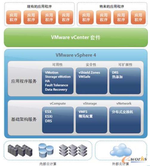 VMware vSphere是業(yè)界業(yè)界首款云計算操作系統(tǒng),它利用虛擬化的強(qiáng)大能力將數(shù)據(jù)中心轉(zhuǎn)換為顯著簡化的云計算基礎(chǔ)架構(gòu),使IT組織能夠利用內(nèi)部和外部資源,安全和低風(fēng)險地提供新一代靈活可靠的IT服務(wù)。其軟件架構(gòu)如下圖所示: