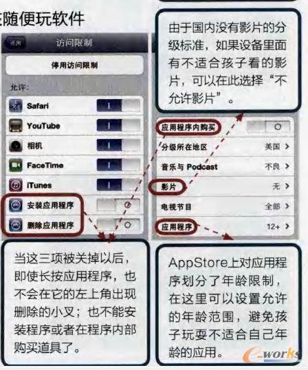 很多有小孩的朋友常常會(huì)碰到幾個(gè)問題:要么被孩子莫名其妙地安裝了一些付費(fèi)軟件,要不自己重要的應(yīng)用程序被孩子誤刪了,或者被他們看到一些不該看到的東西……這該怎么做呢?依次進(jìn)入“設(shè)置/通用/訪問限制”,這是所有蘋果設(shè)備基本的設(shè)置選項(xiàng)。首先點(diǎn)擊“啟用訪問限制”,然后同前面一樣輸入四位密碼,下面灰色的軟件列表就可以操作了。如果不需要該操作了,點(diǎn)擊“停用訪問限制”,輸入之前設(shè)置的密碼就可以了。
