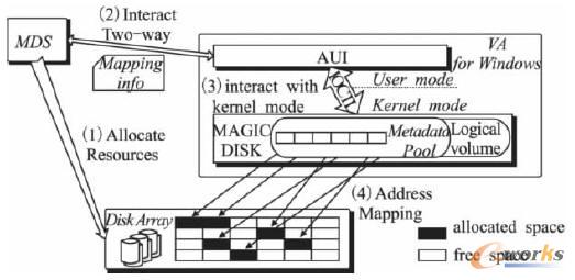 存儲(chǔ)虛擬化系統(tǒng)按需分配功能設(shè)計(jì)如圖1所示,系統(tǒng)由元數(shù)據(jù)服務(wù)器MDS,客戶端軟件VA-forwindows以及磁盤陣列組成,三者由光纖通道相互連接組成帶外SAN架構(gòu),其中MDS負(fù)責(zé)從磁盤陣列中整合存儲(chǔ)資源并從中為按需分配卷分配存儲(chǔ)空間,構(gòu)建邏輯地址與物理地址之間的映射關(guān)系,即映射表,VA-for windows 作為存儲(chǔ)虛擬化系統(tǒng)的客戶端軟件,由AUI和MAGICDISK兩個(gè)模塊組成,用戶態(tài)的AUI模塊負(fù)責(zé)從MDS接受虛擬化指令和映射表,并通過(guò)IOCTL與內(nèi)核態(tài)進(jìn)行信息交互;虛擬卷驅(qū)動(dòng)模塊MAGICDISK在內(nèi)核態(tài)負(fù)責(zé)接收來(lái)自AUI的虛擬化指令,并利用映射信息構(gòu)建元數(shù)據(jù)存儲(chǔ)池以創(chuàng)建虛擬設(shè)備,即按需分配卷,在此基礎(chǔ)之上定制I/O訪問(wèn)規(guī)則并完成邏輯地址到物理地址的映射,采用這種用戶態(tài)與內(nèi)核態(tài)相結(jié)合的體系結(jié)構(gòu),將驅(qū)動(dòng)程序中的通信請(qǐng)求從異步的I/O隊(duì)列中分離出來(lái),由用戶態(tài)集中處理通信請(qǐng)求和指令交互,控制指令與數(shù)據(jù)傳輸相分離,可以有效地減小通信壓力,更好地發(fā)揮帶外SAN架構(gòu)高速度、高帶寬的性能優(yōu)勢(shì)。