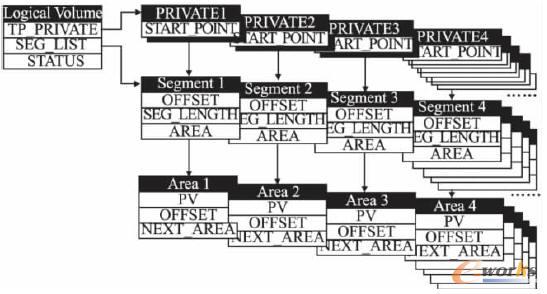 如上頁(yè)圖2所示,在按需分配卷的結(jié)構(gòu)設(shè)計(jì)中,TP_PRIVATE域作為索引結(jié)構(gòu)引導(dǎo)映射信息SEG_LIST域,可將其看作元數(shù)據(jù)存儲(chǔ)池的索引表,Segment結(jié)構(gòu)包含已經(jīng)分配的邏輯起始地址及長(zhǎng)度,Area包含了與其對(duì)應(yīng)的物理地址及偏移長(zhǎng)度,因此從結(jié)構(gòu)上Segment與Area是一一對(duì)應(yīng)的關(guān)系.當(dāng)新的映射關(guān)系到來(lái)時(shí),將其中新的邏輯地址、物理地址以及索引信息添加進(jìn)對(duì)應(yīng)的鏈表結(jié)構(gòu)中。