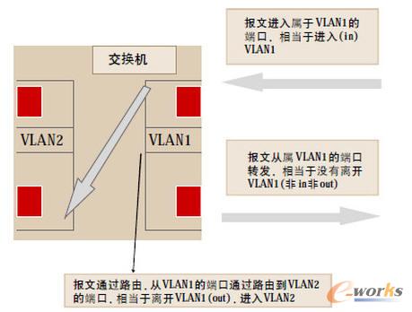 基于VLAN的ACL應用,ACL的運用對象是VLAN,同樣基于VLAN的ACL也有in和out方向,但和基于接口的ACL應用的in和out不同的是,這里所謂的in和out方向是針對VLAN而言的,不是針對接口而言的。如圖2所示: