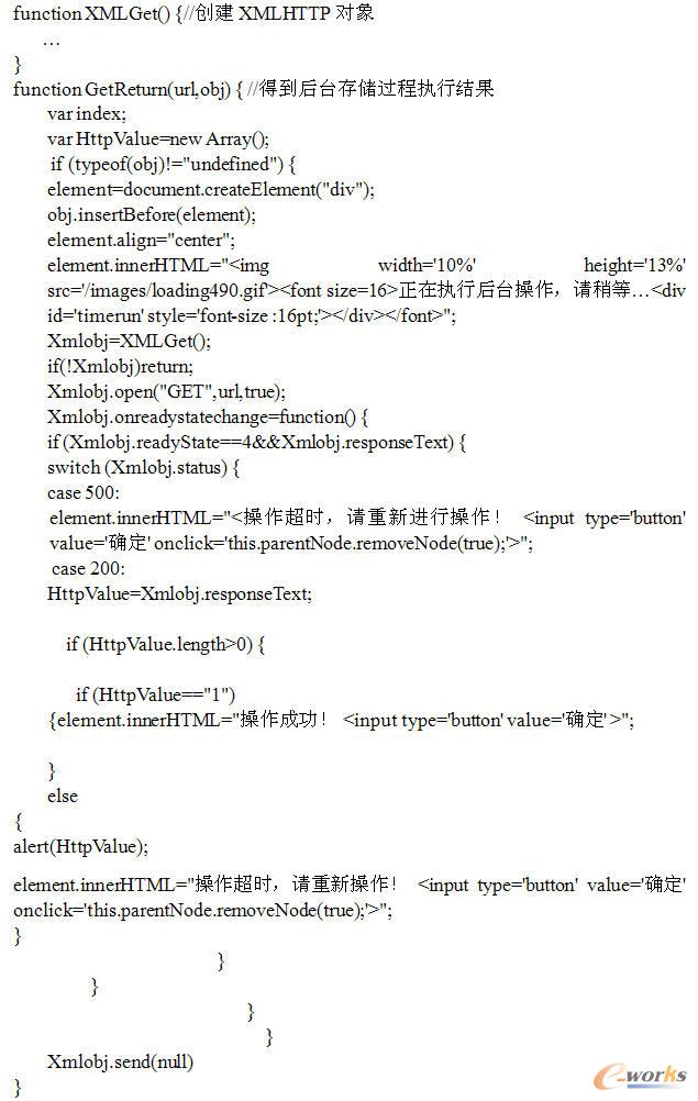企業(yè)信息系統(tǒng)應(yīng)用中,往往在后臺(tái)處理許多復(fù)雜的業(yè)務(wù)邏輯,最常用的手段是調(diào)用數(shù)據(jù)庫(kù)后臺(tái)的存儲(chǔ)過(guò)程,為了不使靜態(tài)頁(yè)面長(zhǎng)時(shí)間處于等待狀態(tài),可采用此方法:在前臺(tái)顯示Gif動(dòng)畫(huà),通過(guò)Ajax調(diào)用后臺(tái)存儲(chǔ)過(guò)程,關(guān)鍵代碼如下: