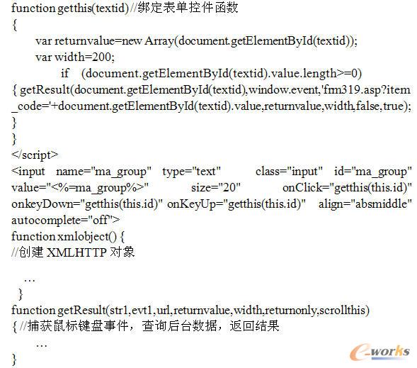 在企業(yè)信息系統(tǒng)中,有時(shí)用戶(hù)會(huì)錄入大量數(shù)據(jù)信息,而有的數(shù)據(jù)項(xiàng)必須是系統(tǒng)已有的數(shù)據(jù),用戶(hù)希望在錄入數(shù)據(jù)時(shí)系統(tǒng)提供自動(dòng)填充功能,無(wú)論輸入部分漢字、英文或數(shù)字或是其中任意組合,系統(tǒng)能彈出完整信息供用戶(hù)選擇,類(lèi)似百度的自動(dòng)填充效果,利用A jax技術(shù)可實(shí)現(xiàn)此功能,關(guān)鍵代碼如下: