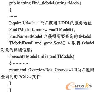 下面是系統(tǒng)服務引用模塊中根據(jù)tModel參數(shù),尋找Web服務包裝器在UDDI中注冊的WSDL文件地址的部分代碼:
