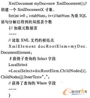 利用Visual Studio.NET 2005開發(fā)平臺與C#程序語言來開發(fā)此異構中間件,同時用DOM來對XML進行解析。以下是系統(tǒng)實現(xiàn)中解析XML的部分代碼。