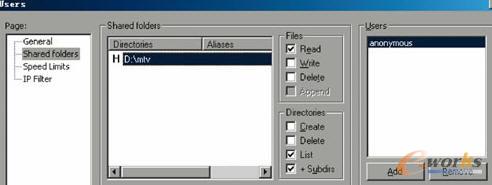 1.匿名用戶的添加:點擊管理界面上面的用戶圖標(biāo),打開用戶設(shè)置窗口,在右側(cè)用戶列表中點擊“Add”打開添加用戶賬號界面,輸入用戶anonymous,點擊“確認”。在左側(cè)列表中點擊“shared folders”,然后在右側(cè)“shared folders”頁面點擊“Add”,打開瀏覽文件夾窗口,選擇需要共享的文件夾,然后根據(jù)需要賦予用戶對文件夾的權(quán)限。這樣我們就可以使用FTP客戶端,匿名登陸FTP服務(wù)器了。