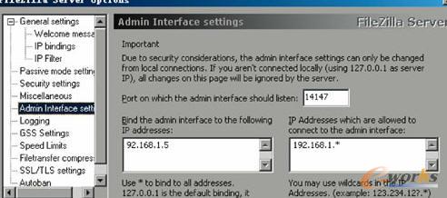 3.設(shè)置遠程訪問服務(wù)器。點擊左側(cè)列表的“Admin Interface settings”選項,在右側(cè)“Port on which the admin interface should listen”后的文本框中設(shè)置服務(wù)器的遠程連接端口,這里保持默認的14147端口。在“Bind the admin interface to the following IP address”文本框中輸入本機的IP地址,在右側(cè)“IP address which are allowed to connect to the admin interface”文本框中輸入允許遠程連接本機的IP地址或地址段,如192.168.1.5或者192.168.1.*,然后選中“Change admin password”復(fù)選框,在文本框中輸入遠程管理的密碼,這樣我們在另外一臺已經(jīng)安裝FileZilla Server的電腦上打開FileZilla Server,點擊File- Connect to server,在Connect to server窗口的“server address”:中輸入目的服務(wù)器的IP地址、端口號、管理密碼即可遠程管理FTP服務(wù)器。