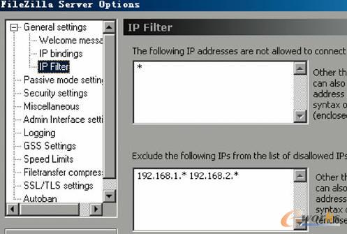 2.IP訪問限制:如果我們只想讓指定IP地址或地址段訪問我們的FTP服務(wù)器,可以點擊“General settings-IP Filter”,在右側(cè)窗口的“The following IP address are not allowed to connect to the server”文本框中輸入“*”,這樣我們就阻止了所有IP地址的訪問,然后在下面的文本框中輸入允許訪問的IP地址或地址段,多個IP地址或地址段使用空格分開。注意,此處輸入的IP格式支持常用的通配符格式,比如我們輸入192.168.1.*表示192.168.1.0整個網(wǎng)段。