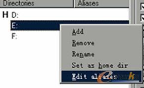 雖然我們把E、F盤都添加到主目錄并賦予用戶權(quán)限,但是我們?nèi)匀粺o法訪問這些資源,因為我們還需要將這些目錄映射到主目錄中。方法是:右鍵單擊列表中的“E:”目錄,選擇“Edit aliases”,然后在打開的窗口中輸入目錄別名,比如我們要將E盤映射為D盤的disce目錄,那么我們需要在此輸入D:\disce。同時我們把F盤映射為D:\discf,這樣當(dāng)我們使用FTP客戶端登陸服務(wù)器以后就可以看到disce和discf兩個文件夾并訪問了。