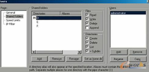 (2)虛擬路徑設(shè)置:默認情況下我們添加的第一個目錄是主目錄,就是我們登錄FTP服務(wù)器后看到的目錄,目錄前面有一個大寫的H字樣。我們可以將主目錄以外的其他目錄添加到主目錄中。比如我們把電腦的E和F盤都添加進去,并賦予用戶權(quán)限。如果我們要設(shè)置E盤為主目錄,我們可以選中E盤,然后點擊“Set as home dir”按鈕,E盤前面出現(xiàn)一個H字符,表明E盤是用戶的主目錄。