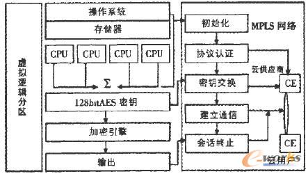 建立通信:CE之間的連接通過標(biāo)簽邊緣路由進(jìn)行建立。在MPLS網(wǎng)絡(luò)中,LSP(Labelb Switch Path,標(biāo)簽交換路徑)是由兩個(gè)端點(diǎn)間的標(biāo)記所決定的,分為動(dòng)態(tài)LSP和靜態(tài)LSP兩類。動(dòng)態(tài)LSP是由路由信息生成的,而靜態(tài)LSP是指定的。邏輯分區(qū)使用AES算法對(duì)數(shù)據(jù)進(jìn)行加密這種加密是基于ECB( Electronic Code Book,電子源碼書)模式的,通過這種模式,數(shù)據(jù)流會(huì)快速傳送給云用戶。加密使用的是一次性密鑰,即使數(shù)據(jù)包被探測(cè)到也很難對(duì)其解密,使得數(shù)據(jù)的安全性得到充分保證。