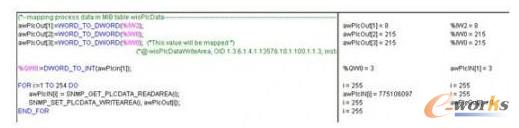 用于將750-841中的某些數(shù)據(jù)按DWORD類型設(shè)置到指定的OID-memory中,范圍從 1.3.6.1.4.1.13576.10.1.100.1.1.3.1 到 1.3.6.1.4.1.13576.10.1.100.1.1.3.100,換句話說,將CoDeSys 中的數(shù)據(jù)傳送到WAGO-MIB管理信息庫的 wioPlcDataWriterArea中。功能SNMP_GET_PLCDATA_READAREA用于讀取用戶在WAGO-MIB管理信息庫的 wioPlcDataReadArea中設(shè)置的數(shù)據(jù)并將這些數(shù)據(jù)顯示在CoDeSys中的一個指定數(shù)組中,也就是說將wioProcessImage中的 數(shù)據(jù)傳送到CoDeSys中。