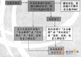 3)以運(yùn)維臺(tái)帳為基礎(chǔ),自動(dòng)控制交換機(jī),實(shí)現(xiàn)對(duì)終端設(shè)備接入內(nèi)網(wǎng)的控制,并將讀取的信息存入大型關(guān)系型數(shù)據(jù)庫(kù),可對(duì)交換機(jī)端口實(shí)時(shí)綁定的MAC與運(yùn)維臺(tái)帳進(jìn)行比較,將無(wú)臺(tái)帳信息進(jìn)行斷網(wǎng)處理.待用戶辦理相關(guān)手續(xù)后重新接入網(wǎng)絡(luò),形成操作日志,以供查詢分析。