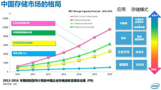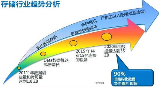 在做存儲(chǔ)行業(yè)趨勢(shì)分析時(shí),亢海峰指出,“來(lái)自IDC的數(shù)據(jù)顯示,未來(lái)幾年間數(shù)據(jù)量從2011年的1.8ZB,在2015年會(huì)增長(zhǎng)為35個(gè)ZB。十年前,大家還在使用3.5英寸的盤,5.5英寸的盤,后來(lái)有了光盤和DVD,不同的介質(zhì),存儲(chǔ)的數(shù)據(jù)越來(lái)越多。