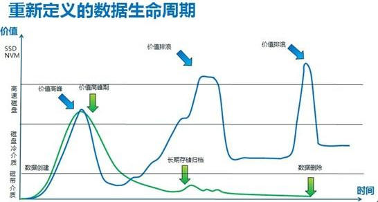 對(duì)于存儲(chǔ)來(lái)講怎么劃分這種周期?“最下面的存儲(chǔ)介質(zhì)大家基本上放在磁帶上需要長(zhǎng)期的歸檔.或者放在磁盤庫(kù)上,或者是大容量的,低成本的介質(zhì)上.對(duì)性能又一定需要的數(shù)據(jù)就用高速的磁盤,性能要求再高的用閃存盤,SSD等等的數(shù)據(jù)。