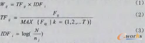 公式(1)中,Wij表示在文檔dj中,關(guān)鍵字 所占的比重。 由其Wij對(duì)應(yīng)的TFij值和IDFi值計(jì)算得出。這兩部分的計(jì)算公式如公式(2)和公式(3)所示。在公式(2)和公式(3)中,F(xiàn)ij表示關(guān)鍵字Ki 在文檔dj中的出現(xiàn)頻率,文檔dj中包含T個(gè)關(guān)鍵字,N表示文檔總數(shù), Nj表示包含關(guān)鍵字Ki的文檔總數(shù)。