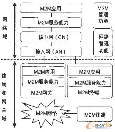 圖2是ETSITS102690V1.1.1技術(shù)規(guī)范中定義的M2M結(jié)構(gòu),主要由網(wǎng)絡(luò)域、終端和網(wǎng)關(guān)域兩部分組成,其中網(wǎng)絡(luò)域部分的作用類似于圖1中M2M平臺(tái)的作用,由M2M應(yīng)用、M2M服務(wù)能力、核心網(wǎng)、接入網(wǎng)、M2M管理功能和網(wǎng)絡(luò)管理功能模塊組成。