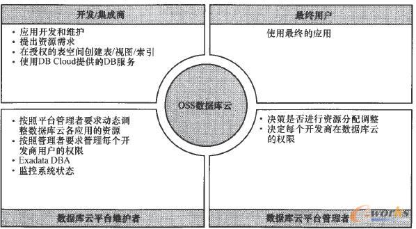 但是這種管理模式革命性的變更,也帶來了對(duì)應(yīng)用/系統(tǒng)管理維護(hù)的新需求。傳統(tǒng)方式中,在大多數(shù)的實(shí)際情況下,應(yīng)用軟件的開發(fā)商SI不僅僅是對(duì)自己的應(yīng)用提供運(yùn)維,而且也對(duì)其應(yīng)用之下的平臺(tái)軟件/硬件進(jìn)行主要的運(yùn)維操作,并根。據(jù)實(shí)際運(yùn)行的情況,對(duì)用戶提出基礎(chǔ)架構(gòu)擴(kuò)容和調(diào)整的需求。在采用PaaS提供數(shù)據(jù)庫云的方式下。之前的SI全部負(fù)責(zé)的方式必然不可行。因?yàn)镾I不再負(fù)責(zé)包括基礎(chǔ)硬件和數(shù)據(jù)庫軟件的數(shù)據(jù)庫平臺(tái)的運(yùn)維,而只是一個(gè)數(shù)據(jù)庫作為服務(wù)的消費(fèi)者,必須要有第三方負(fù)責(zé)相應(yīng)云平臺(tái)的運(yùn)維。同時(shí),由于實(shí)際的情況,SI往往會(huì)提出自己的數(shù)據(jù)庫服務(wù)需要的資源變更請(qǐng)求,對(duì)于這些資源變更請(qǐng)求的評(píng)估和批準(zhǔn)。當(dāng)然也應(yīng)該由SI之外的人員/組織予以完成。簡(jiǎn)單總結(jié)一下,在采用數(shù)據(jù)庫云平臺(tái)后,原來的SI和最終用戶的關(guān)系會(huì)演變成如下4方面的關(guān)系,如圖8所示。