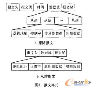 從站報文是從站傳給主站的上行報文,報文格式如圖3b所示。報文頭和報文尾與跟隨報文相同;數(shù)據(jù)區(qū)包括從站邏輯地址、狀態(tài)字、非周期數(shù)據(jù)和周期數(shù)據(jù)。狀態(tài)字是從站傳給主站反饋信息的編號期數(shù)據(jù)中攜帶非周期信息,如系統(tǒng)報警等;周期數(shù)據(jù)中攜帶周期信息,如實際位置、速度等。報文中定義的非周期數(shù)據(jù)、周期數(shù)據(jù)長度可以配置,其他域的長度可以設置為常量。