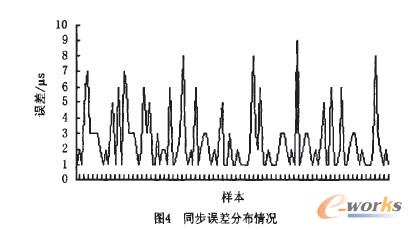 根據(jù)該測試方法設計了測試實驗。為了運行誤差測量程序,將通信周期延長為正常部分和測量部分。正常部分完成同步與實時通信,測量部分完成誤差測量。為減少測量過程中t。。時間不確定性所帶來的誤差,采用接近硬件層的處理方法。通過對大量誤差樣本的統(tǒng)計分析,誤差平均值為6弘s。最大值不超過10弘s。圖4所示為測量所得誤差的分布情況。