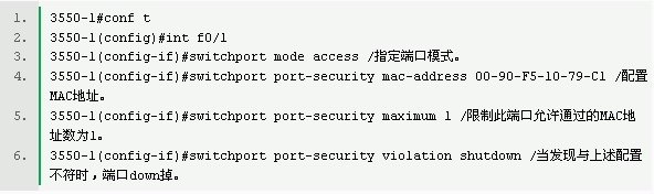 當(dāng)發(fā)現(xiàn)主機(jī)的MAC地址與交換機(jī)上指定的MAC地址不同時(shí) ,交換機(jī)相應(yīng)的端口將down掉。當(dāng)給端口指定MAC地址時(shí),端口模式必須為access或者Trunk狀態(tài)。