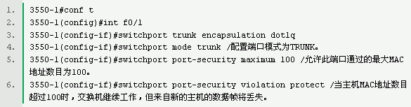 此配置允許一TRUNK口最多通過100個(gè)MAC地址,超過100時(shí),但來自新的主機(jī)的數(shù)據(jù)幀將丟失。