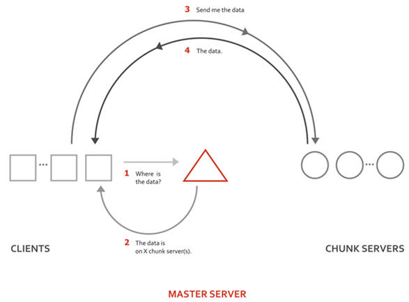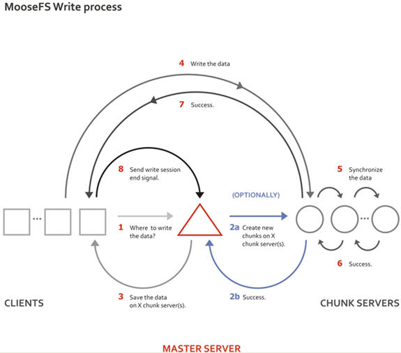 MFS的網(wǎng)絡(luò)分三部分組成,MASTER SERVER、CHUNK SERVER 和 CLIENT,其中MASTER SERVER只有一個(gè),而CHUNK SERVER 和CLIENT可以有多個(gè)。MFS讀進(jìn)程和寫進(jìn)程的工作機(jī)制分別如下圖:
