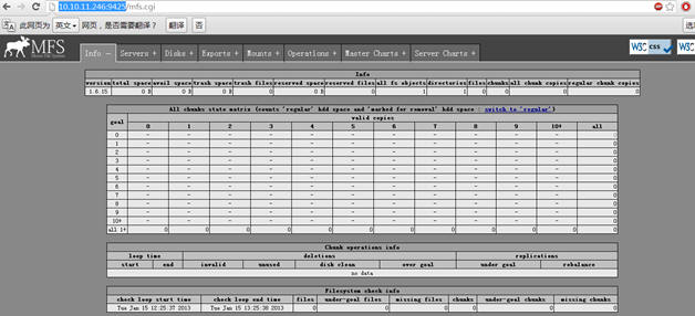現(xiàn)在 在通過瀏覽器訪問:http://10.10.11.246:9425 就可以看到這個(gè)MooseFS系統(tǒng)的全部信息,包括主控master和存儲(chǔ)服務(wù)器chunkserver